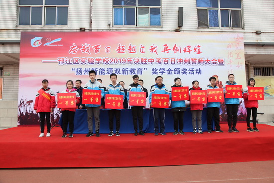 3月8日下午,由江蘇新能源置業(yè)集團(tuán)設(shè)立的主題為新教育、新家庭的新能源雙新教育獎(jiǎng)學(xué)金;頒獎(jiǎng)活動(dòng)在邗江區(qū)實(shí)驗(yàn)學(xué)校舉行。邗江區(qū)政府、邗江區(qū)教育局等相關(guān)領(lǐng)導(dǎo)出席頒獎(jiǎng)活動(dòng)?! ∈紫龋踅瓍^(qū)實(shí)驗(yàn)學(xué)校九年級(jí)全體同學(xué)進(jìn)行奮戰(zhàn)百日、超越自我、再創(chuàng)輝煌;決勝中考宣誓。接著,活動(dòng)現(xiàn)場(chǎng)舉行聘請(qǐng)人生導(dǎo)師儀式,一批學(xué)生和家長(zhǎng)向人生導(dǎo)師頒發(fā)聘書。在歡快熱烈的氣氛中...