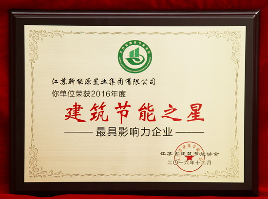 12月20日,從常州傳來好消息,江蘇省建筑節(jié)能協(xié)會授予江蘇新能源置業(yè)集團有限公司2016年度江蘇省建筑節(jié)能之星;稱號,被評為最具影響力企業(yè)。此次由江蘇省建筑節(jié)能協(xié)會進行的江蘇建筑節(jié)能之星;評比活動,旨在提高整個建筑行業(yè)的節(jié)能意識,進一步推廣建筑高效節(jié)能技術(shù),表彰建筑節(jié)能行業(yè)示范工程,宣傳建筑節(jié)能行業(yè)的先進經(jīng)驗,對大力實施節(jié)能減排措施,...