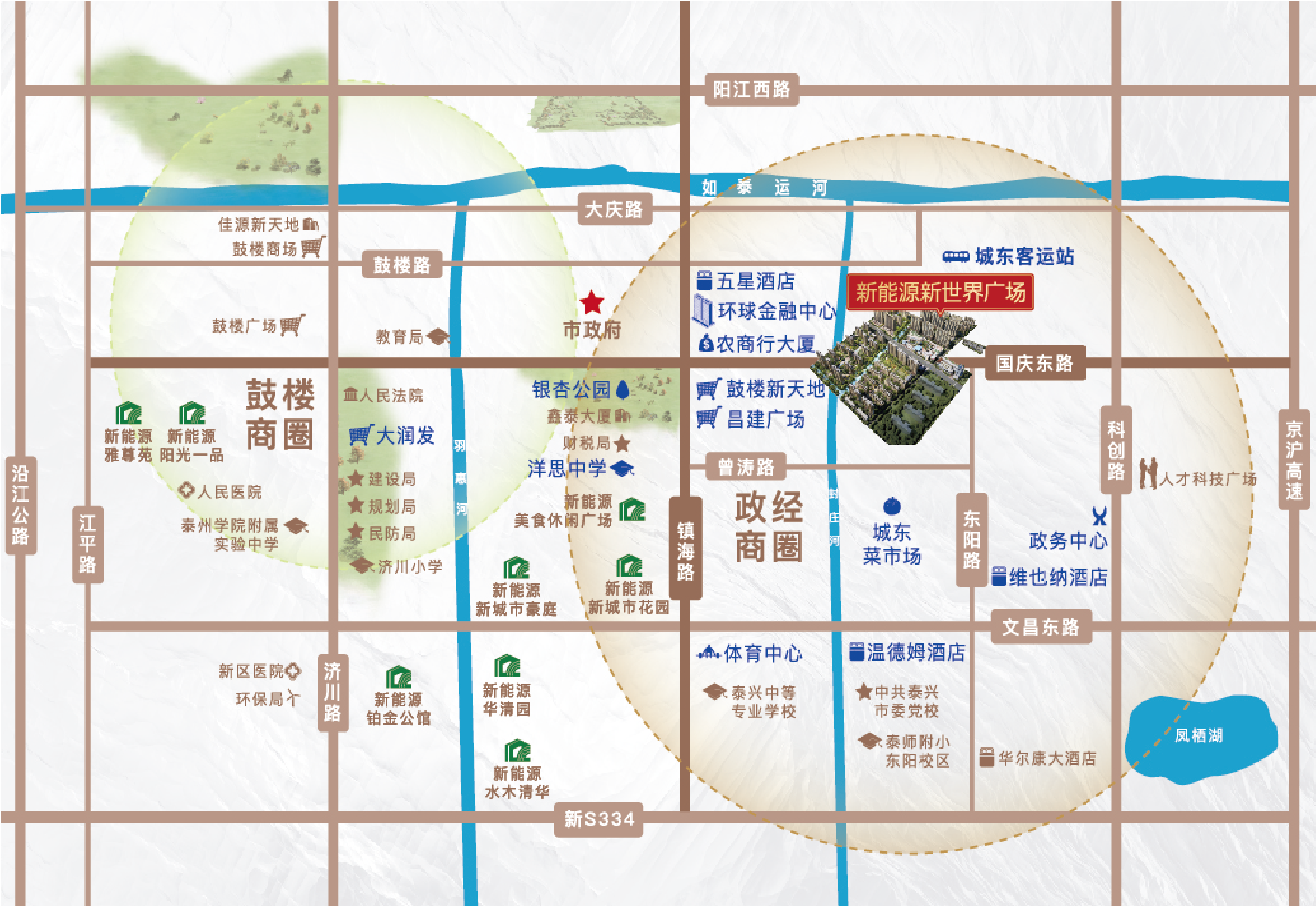 新能源·新世界廣場位于國慶東路與鎮(zhèn)海中路交匯處,是泰興唯一一個(gè)125萬方集五大核心優(yōu)勢于一身的的萬戶精英社區(qū)。項(xiàng)目周邊配套醇熟,市政府、大潤發(fā)、環(huán)球金融中心、五星級酒店、體育館以及洋思中學(xué)等名校環(huán)繞,自帶19萬方的“公園式商業(yè)”昌建廣場,與泰興鼓樓購物中心合作打造鼓樓新天地,筑就城市新中心。