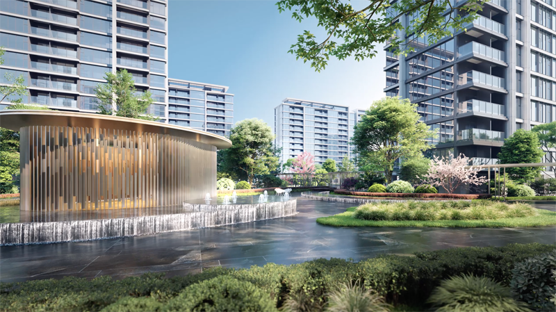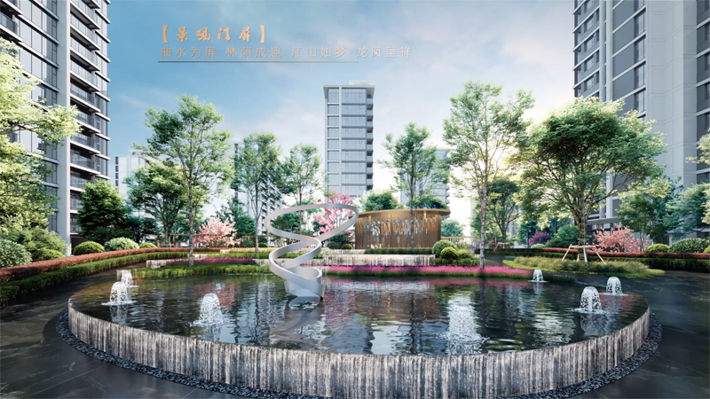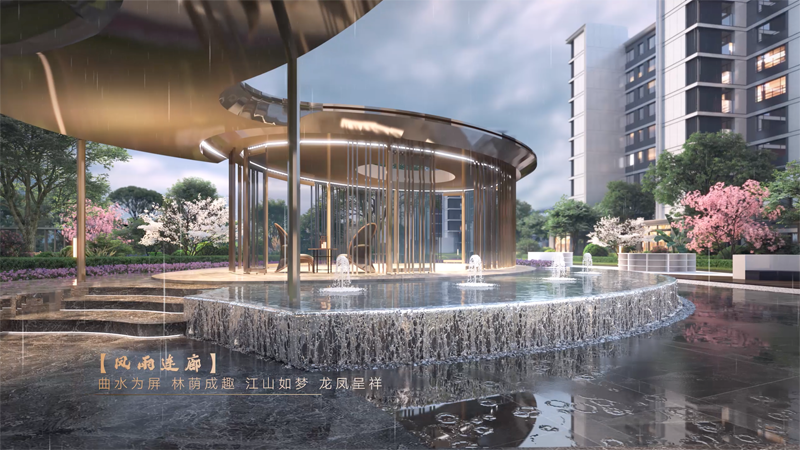 迎賓水景配以噴泉景觀以裝飾,將鏡面水景加以藝術(shù)表達(dá),形成龍鳳呈祥之勢(shì),門庭若水定財(cái)源不絕,整體大氣、恢弘,具有儀式感。