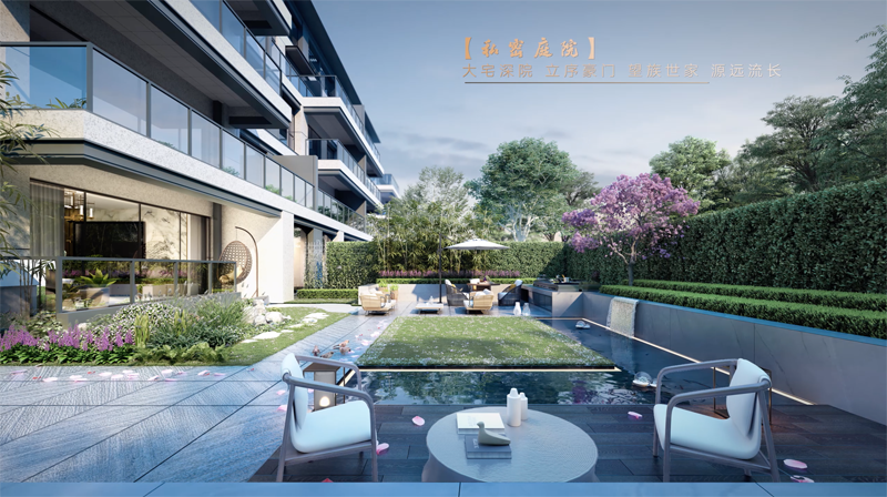 入口處隱約可見的水幕溪流景觀演繹家族的門風(fēng)禮贊;龍曲水景倒影綠林,光影縱橫潑墨如畫,營(yíng)造從大門到宅邸的遞進(jìn)式體驗(yàn)。