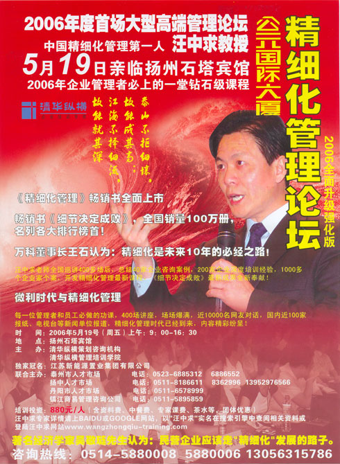 由公元國際大廈獨(dú)家冠名的2006年度首場(chǎng)大型高端管理論壇精細(xì)化管理論壇將于5月19日在石塔賓館隆重舉行。中國精細(xì)化管理第一人汪中求教授將親臨現(xiàn)場(chǎng)為企業(yè)管理者講授一次鉆石級(jí)課程。公元國際大廈作為甲級(jí)寫字樓為業(yè)主提供了高品質(zhì)的創(chuàng)業(yè)平臺(tái),精細(xì)化管理則是每一個(gè)現(xiàn)代企業(yè)所倡導(dǎo)的管理理念,是未來十年的必經(jīng)之路。據(jù)悉,凡公元國際大廈業(yè)主均可獲贈(zèng)價(jià)值888元門票一張和汪中求《精細(xì)化管理》力作一本。