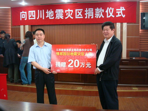 災(zāi)難無情人有情,一方有難八方支援。四川汶川發(fā)生強(qiáng)烈地震的消息傳來,泰興市新能源新城市花園的開發(fā)商江蘇新能源置業(yè)集團(tuán)泰興分公司立即與泰興市政府相關(guān)部門聯(lián)系,于2008年5月15日上午10:30在泰興市政府會(huì)議室向?yàn)?zāi)區(qū)人民捐款20萬元,以表達(dá)對災(zāi)區(qū)人民的深情關(guān)愛。