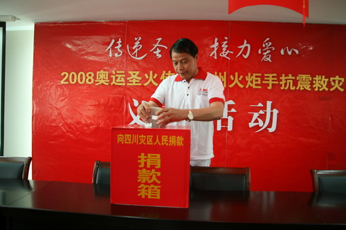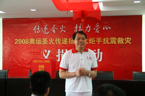 在捐贈(zèng)儀式上,包廣林動(dòng)情地說:作為一名神圣的奧運(yùn)火炬手,在距離奧運(yùn)會(huì)開幕還有88天的5月12日,一場(chǎng)巨大的自然災(zāi)害突然降臨到天府之國四川汶川,一個(gè)個(gè)生命的消逝,一片片房屋的倒塌聽聞這幾日的新聞報(bào)道,我們的心情沉痛無比。在此,我呼吁各位火炬手,伸出我們的雙手,奉獻(xiàn)我們的愛心,為災(zāi)區(qū)的救援和重建貢獻(xiàn)自己的一份力量!在危難中托起愛的方舟;。