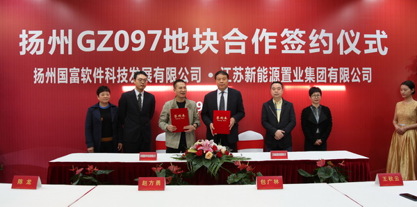 3月15日上午,江蘇新能源置業(yè)集團(tuán)有限公司與揚(yáng)州國(guó)富軟件科技發(fā)展有限公司舉行GZ097項(xiàng)目簽約儀式,新能源置業(yè)集團(tuán)董事長(zhǎng)包廣林、總裁王秋云,國(guó)富科技董事長(zhǎng)趙方勇、總監(jiān)陳龍等出席。