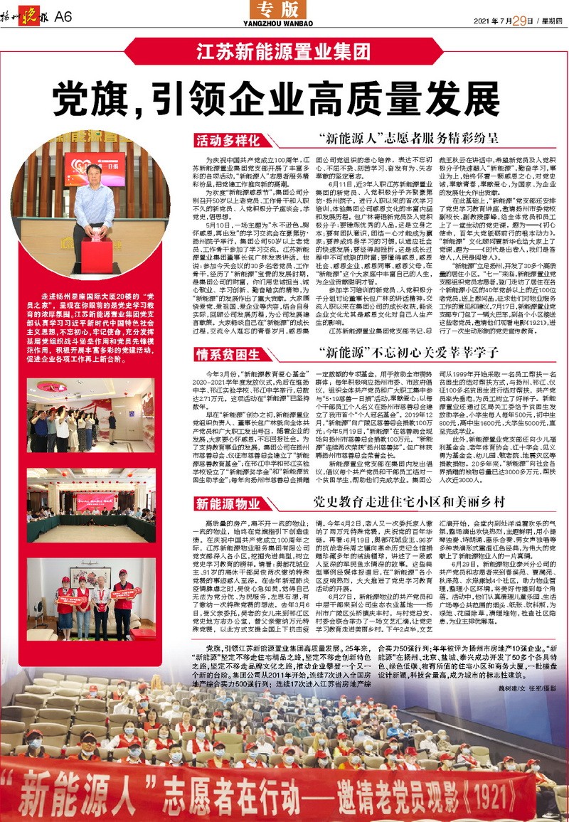 為慶祝中國(guó)共產(chǎn)黨成立100周年,江蘇新能源置業(yè)集團(tuán)黨支部開展了豐富多彩的各項(xiàng)活動(dòng),“新能源人”志愿者服務(wù)精彩紛呈,把黨建工作推向新的高潮。