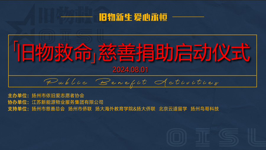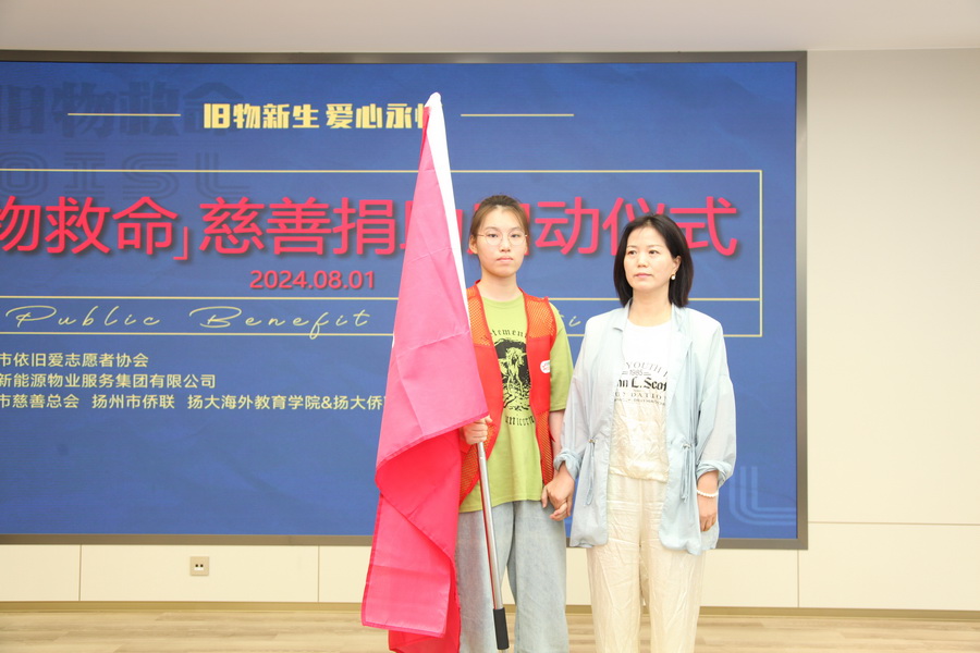 8月1日,“舊物救命”慈善捐助啟動儀式在新能源數(shù)智大廈舉行。此次活動由揚州市依舊愛志愿者協(xié)會主辦,江蘇新能源物業(yè)服務(wù)集團有限公司協(xié)辦,揚州市慈善總會、揚州市僑聯(lián)、揚州大學(xué)海外教育學(xué)院、北京云道留學(xué)咨詢有限公司、揚州鳥哥科技有限公司等為支持單位。